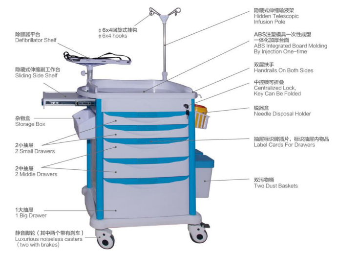 Medical Emergency Trolley is Medical Equipment, also belongs to surgical instruments, medicines, and transporting patients. It can greatly reduce the operational burden of caregivers. Medical Emergency Trolley Equipment comes in deluxe, medium and ordinary. According to the material of the product, medical carts are made of ABS, stainless steel and plastic sprayed. According to the types of products, medical carts include rescue carts, emergency carts, treatment carts, medical record carts, equipment carts, instrument carts, medicine delivery carts, anesthesia carts, dirt carts, infusion carts, medicine pickup carts, and drop-off carts. , pick up the car and Emergency Ambulance Equipment.